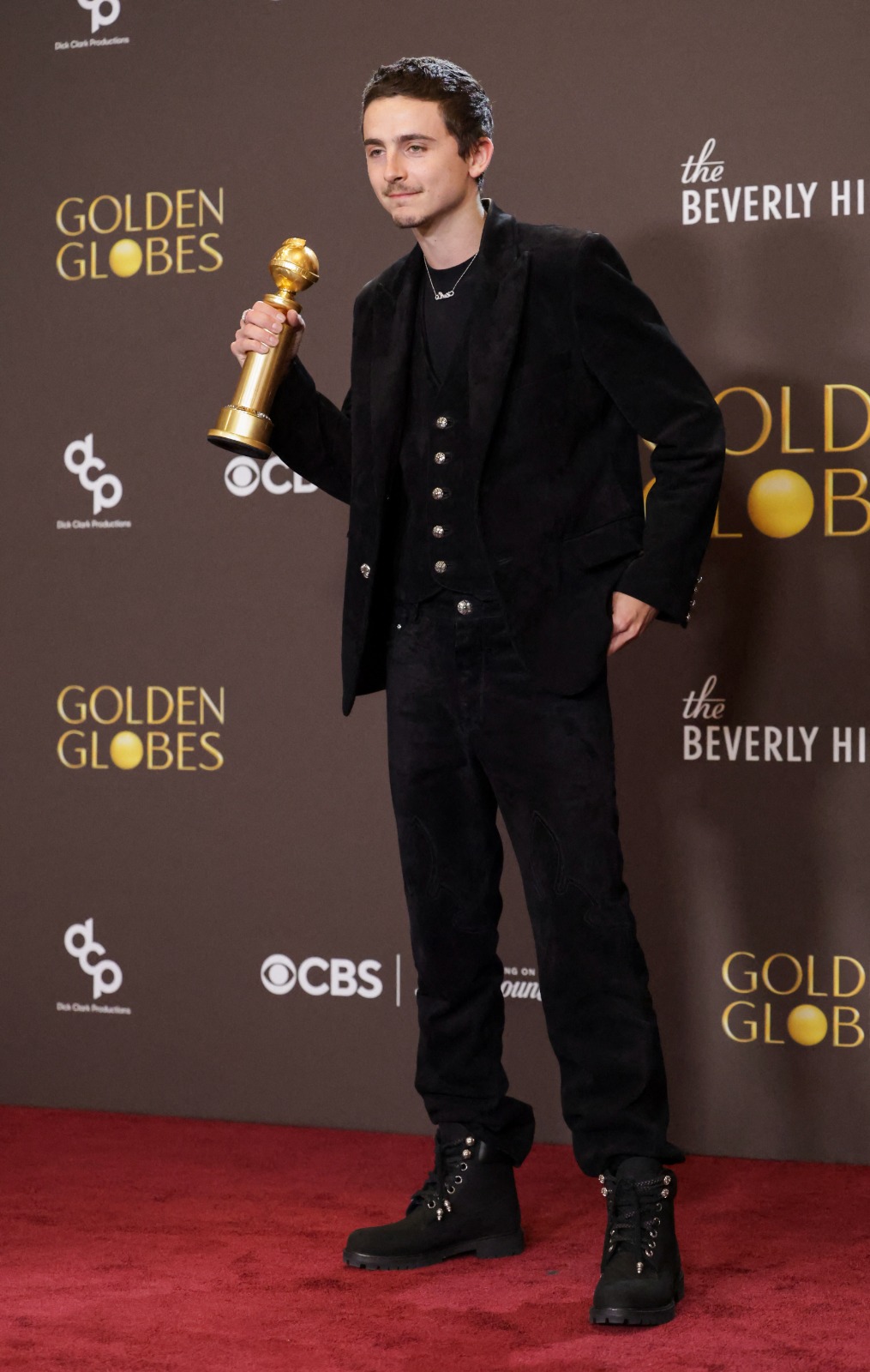 Timothee Chalamet, who won big at the Golden Globes this year, went for an all-black look with a little touch of silver. He was joined by his girlfriend, Kylie Jenner, who chose a custom, curve-hugging gown in a metallic hue. At the ceremony, Timothee Chalamet won his first Golden Globe Award for his performance in 'Marty Supreme'.