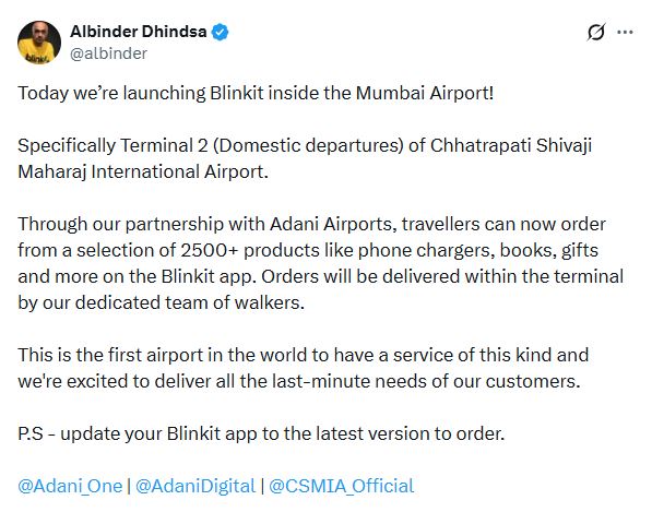 Albinder Dhindsa, Co-Founder of Blinkit, took to X (formally Twitter) to announce the launch saying, "Through our partnership with Adani Airports, travellers can now order from a selection of 2500+ products like phone chargers, books, gifts and more on the Blinkit app. Orders will be delivered within the terminal by our dedicated team of walkers."