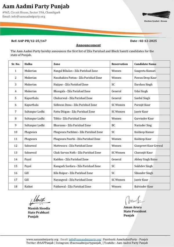 The candidate list has been approved and signed by AAP Punjab State Prabhari Manish Sisodia and State President Aman Arora. AAP leadership stated that the selection process emphasised grassroots presence and social representation, underscoring the party's aim to strengthen rural governance through capable, community-connected candidates.