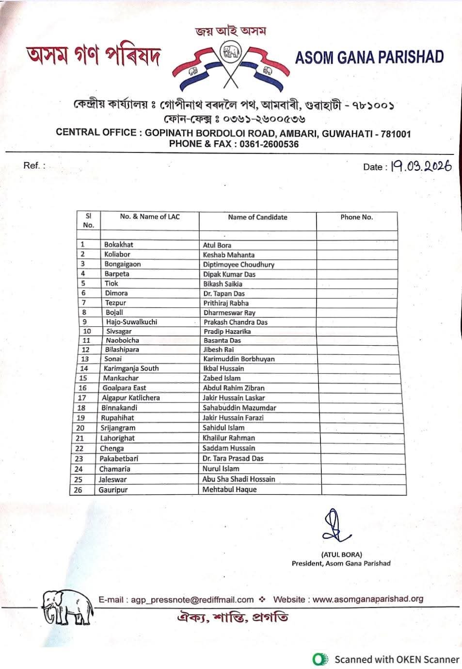 AGP releases 26 candidates list for Assam polls; Party president Atul Bora to contest from Bokakhat