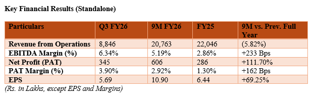 * 9M Milestone: Net Profit for 9M FY26 reached ₹606.19 lakhs, already surpassing the total FY25 full-year profit by 111.7%.