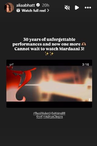 Alia Bhatt shared the trailer of 'Mardaani 3' on her Instagram story and wrote, "30 years of unforgettable performances and now one more. Cannot wait to watch Mardaani 3!"