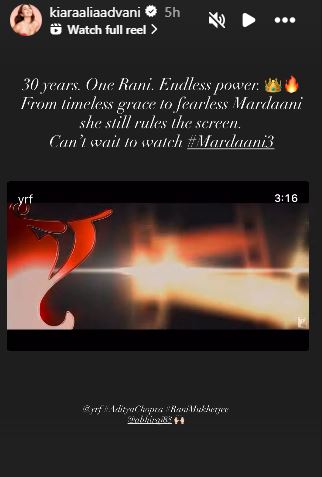 Kiara Advani shared that she couldn't wait to catch the film in theatres as she wrote, "30 years. One Rani. Endless power. From timeless grace to fearless Mardaani, she still rules the screen. Can't wait to watch #Mardaani3."