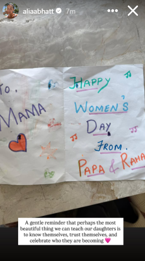 Taking to her Instagram story, Alia shared the picture of an adorable hand-written greeting card, seemingly prepared by little Raha with help from her dad.