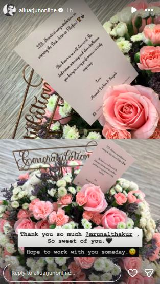Taking to his Instagram story, Allu Arjun shared a picture of the beautiful flower bouquet sent by the 'Hi Nanna' actor along with a heartfelt congratulatory message.