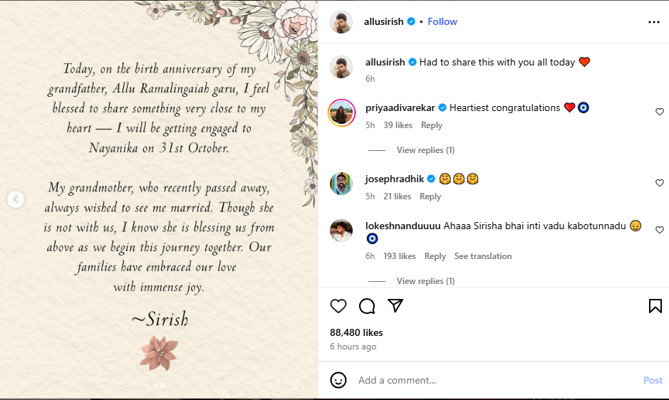 "Today, on the birth anniversary of my grandfather, Allu Ramalingaiah garu, I feel blessed to share something very close to my heart- I will be getting engaged to Nayanika on 31st October," the note read.