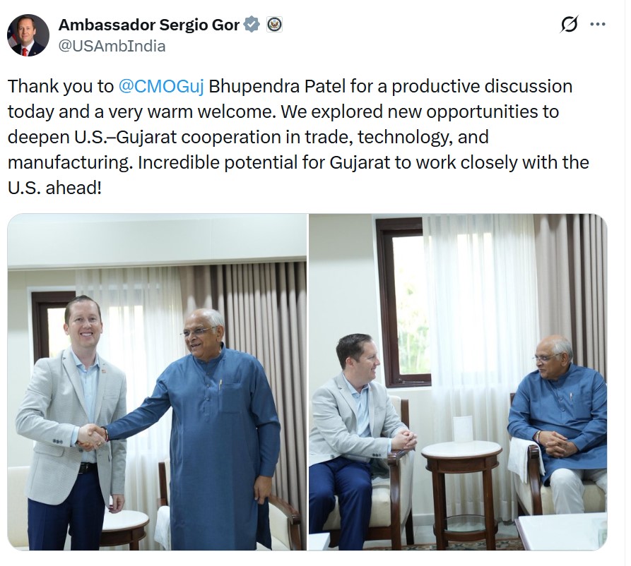 In a post on X, after the meeting on Saturday Sergio Gor wrote, "Thank you to @CMOGuj Bhupendra Patel for a productive discussion today and a very warm welcome. We explored new opportunities to deepen U.S.-Gujarat cooperation in trade, technology, and manufacturing. Incredible potential for Gujarat to work closely with the U.S. ahead!"