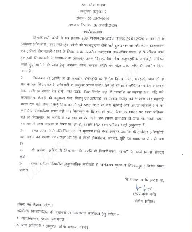 As per the order issued by the Special Secretary, Agnihotri will remain attached to the office of the District Magistrate, Shamli, until the completion of the inquiry.