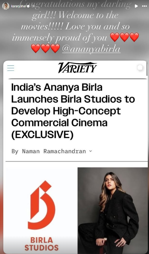 Sharing the news on his Instagram story, Karan wrote, "Congratulations my darling girl!!! Welcome to the movies!!!!! Love you and so immensely proud of you."