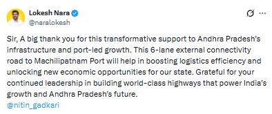 "Sir, A big thank you for this transformative support to Andhra Pradesh's infrastructure and port-led growth. This 6-lane external connectivity road to Machilipatnam Port will help in boosting logistics efficiency and unlocking new economic opportunities for our state. Grateful for your continued leadership in building world-class highways that power India's growth and Andhra Pradesh's future," Lokesh wrote in a post on X.