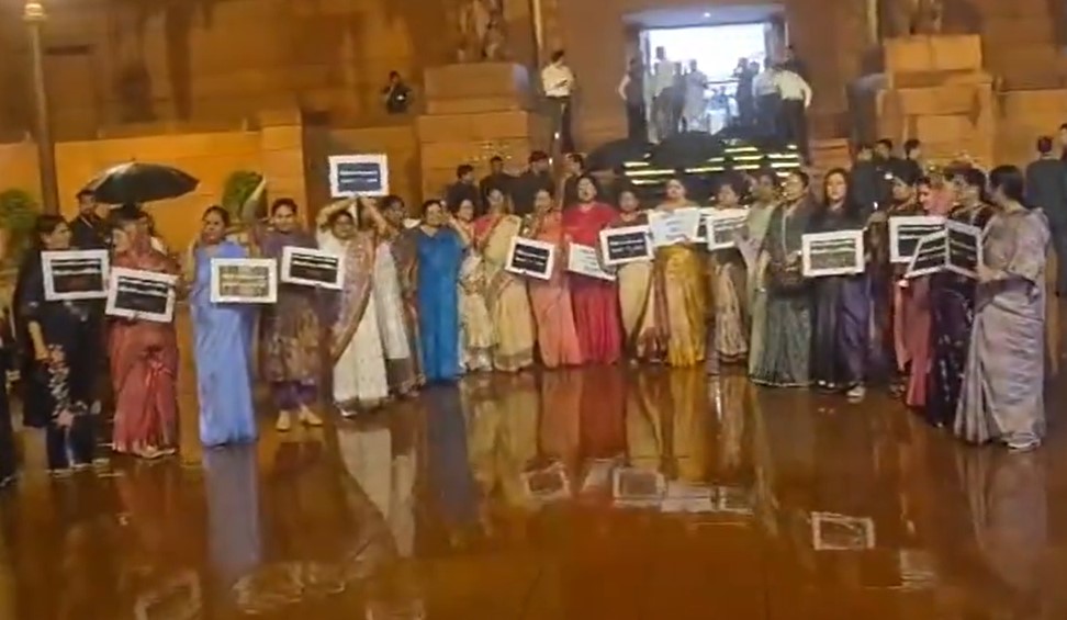 Additionally, women MPs of the NDA held a separate protest in the Parliament premises over the defeat of the Constitutional Bill, holding placards and chanting slogans of "sharam karo" against the Opposition.