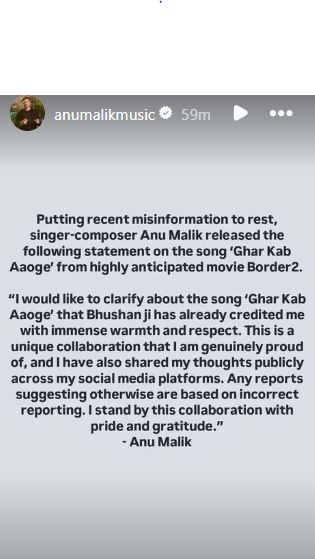 "Putting recent misinformation to rest, singer-composer Anu Malik released the following statement on the song 'Ghar Kab Aaoge' from highly anticipated movie Border 2. I would like to clarify about the song 'Ghar Kab Aaoge' that Bhushan ji has already credited me with immense warmth and respect. This is a unique collaboration that I am genuinely proud of, and I have also shared my thoughts publicly across my social media platforms. Any reports suggesting otherwise are based on incorrect reporting. I stand by this collaboration with pride and gratitude," the statement read.