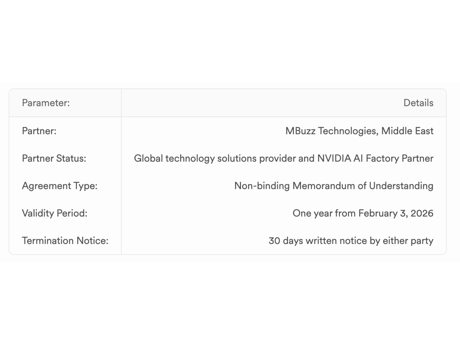 The MoU establishes a framework for cooperation between Aqylon Nexus Limited and MBuzz Technologies, a global technology solutions provider and NVIDIA AI Factory Partner. The partnership focuses on evaluating and exploring opportunities across multiple technology domains.