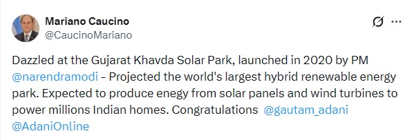 "Dazzled at the Gujarat Khavda Solar Park, launched in 2020 by PM Narendra Modi - Projected the world's largest hybrid renewable energy park. Expected to produce enegy from solar panels and wind turbines to power millions Indian homes. Congratulations Gautam Adani and Adani Group," Caucino posted on X.