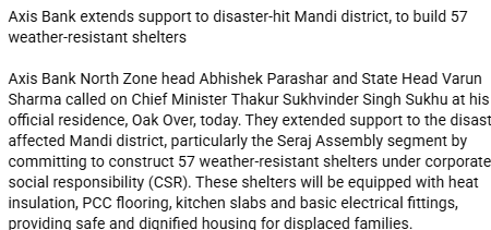 Chief Minister Sukhvinder Singh Sukhu expressed his gratitude to Axis Bank for its humanitarian contribution, emphasizing that such initiatives play a crucial role in helping disaster-hit families rebuild their lives. "This noble effort will go a long way in providing relief and comfort to those affected, while also strengthening the state's disaster preparedness," the Chief Minister said.