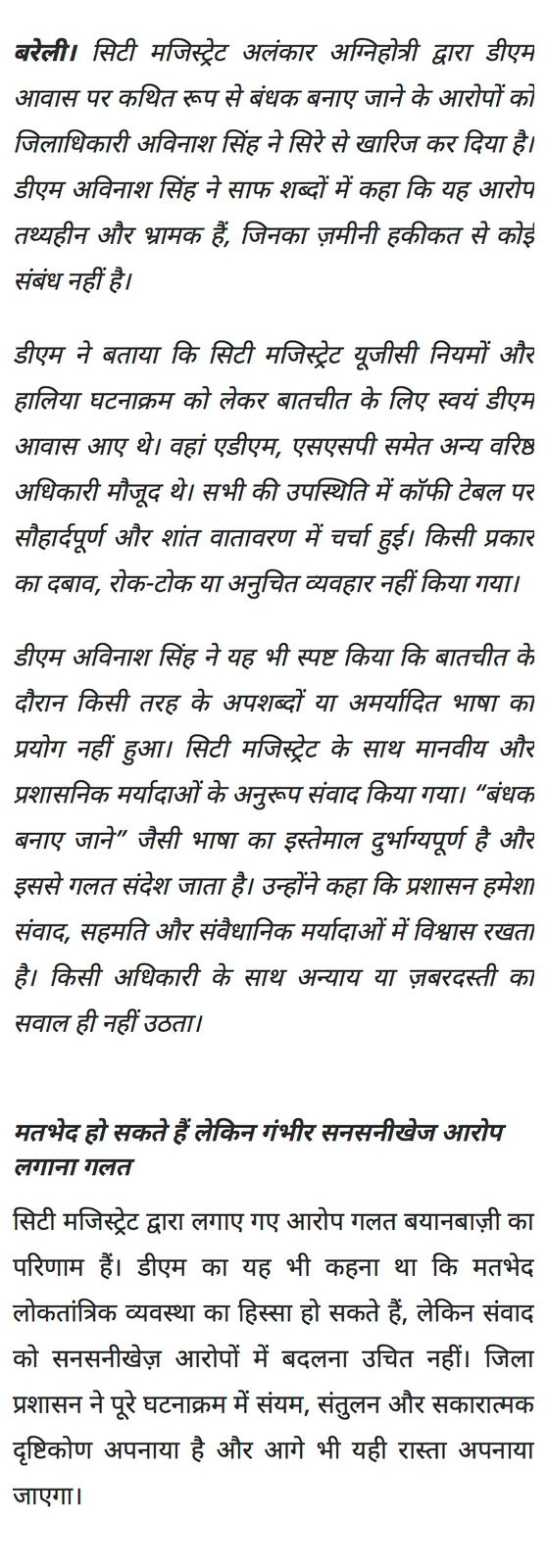 DM Singh, in a statement, said, "The allegations made by the City Magistrate are a result of misrepresentation. The DM also said that differences of opinion can be a part of a democratic system, but it is not appropriate to turn a dialogue into sensational allegations. The district administration has adopted restraint, balance, and a positive approach throughout the entire incident, and will continue to do so"