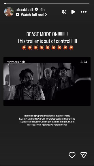Taking to her Instagram Story, the actor shared her excitement about the trailer and praised Ranveer's intense look. Reacting to the action-packed preview, Alia wrote, "BEAST MODE ON!!!!!!!! This trailer is out of control!!!!!!!!"