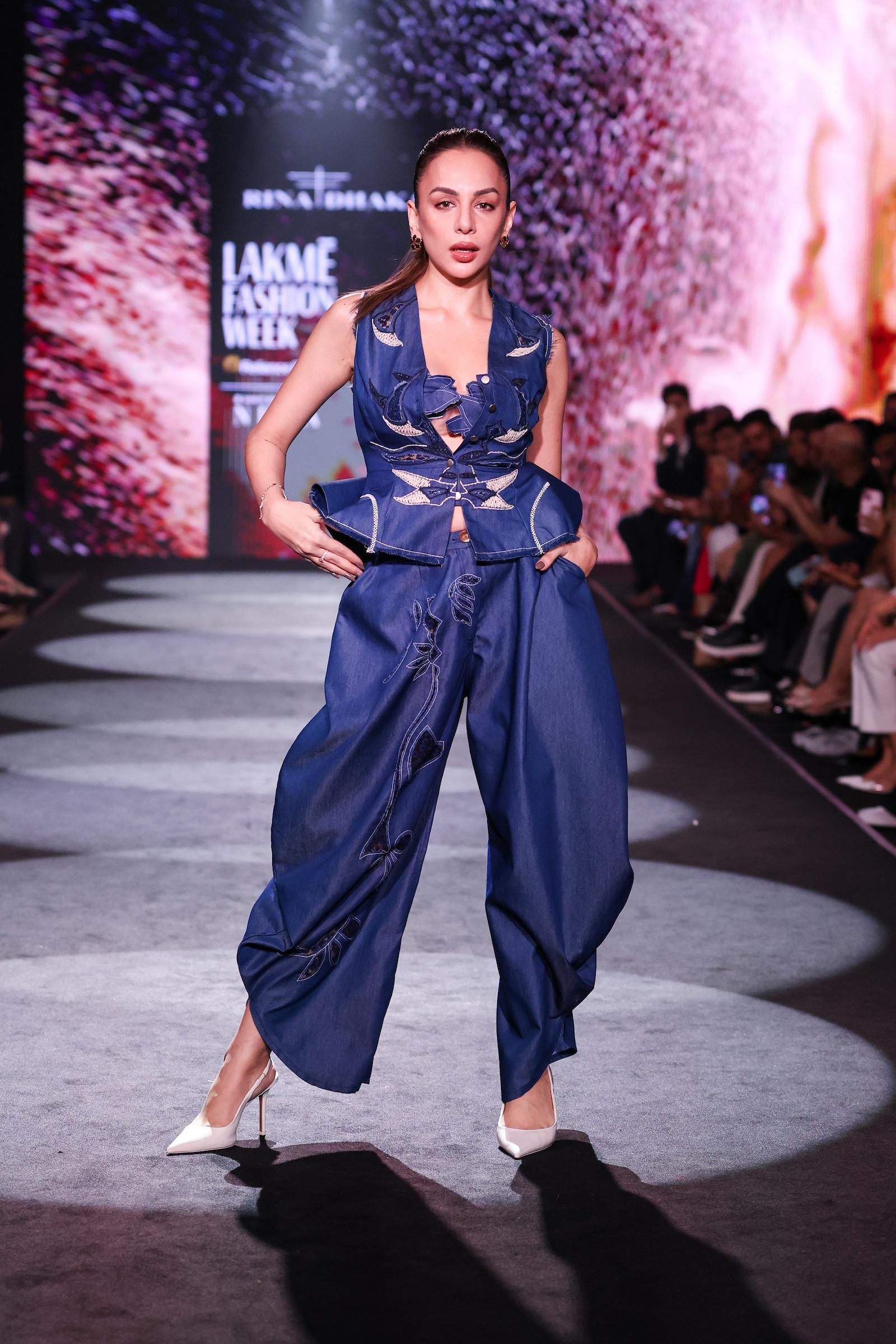 On the other hand, influencer Nitibha Kaul also walked the ramp for Rina, sporting a pair of ink-blue harem pants with a sleeveless peplum blouse.