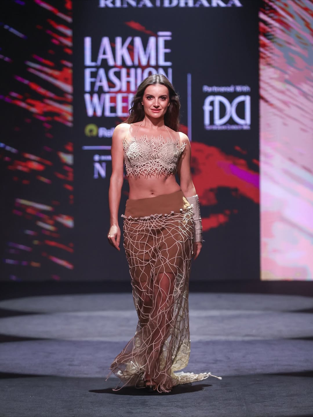 On Sunday, Natalia graced the runway in a stylish look from the shelves of designer Rina Dhaka, who unveiled her Spring/Summer 2026 collection with a blend of rich colours, plisse textures, hand embroidery, and the transformation of waste materials.