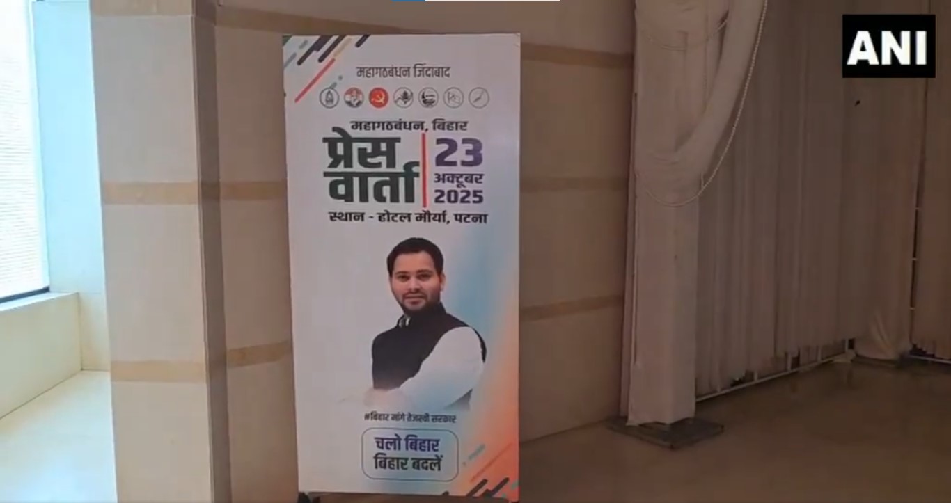 Bihar polls: Mahagathbandhan press conference today; Boards, posters with photos of Tejashwi Yadav put up at venue