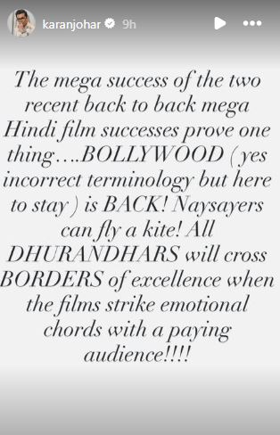 "The mega success of the two recent back to back mega Hindi film successes prove on thing....BOLLYWOOD (yes incorrect terminology but here to stay) is BACK! Naysayers can fly a kite! All DHURANDHARS will cross BORDERS of excellence when the films strike emotional chords with a paying audience!!!!" Karan wrote on Instagram.