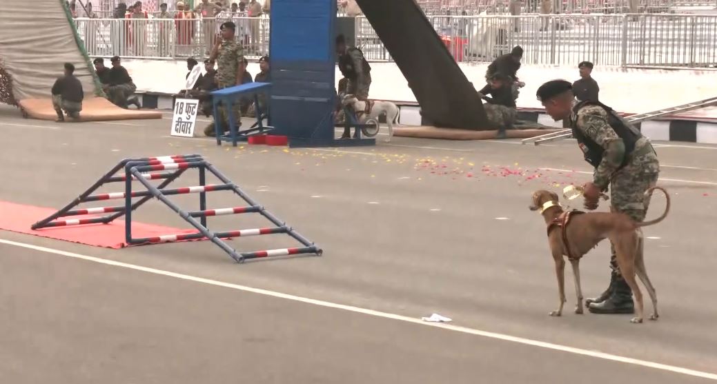 Kevadiya (Gujarat) [India], October 29 : The Border Security Force (BSF) dog squad, featuring Indian breeds Rampur Hound and Mudhol Hound demonstrated their operational skills during the full dress rehearsal parade at the Statue of Unity on Wednesday.