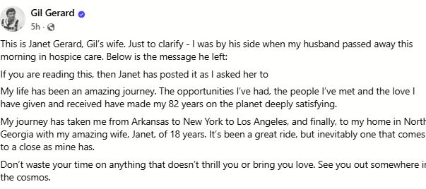 "If you are reading this, then Janet has posted it as I asked her to. My life has been an amazing journey. The opportunities I've had, the people I've met, and the love I have given and received have made my 82 years on the planet deeply satisfying. My journey has taken me from Arkansas to New York to Los Angeles, and finally, to my home in North Georgia with my amazing wife, Janet, of 18 years. It's been a great ride, but inevitably one that comes to a close as mine has. Don't waste your time on anything that doesn't thrill you or bring you love. See you out somewhere in the cosmos," the message read.