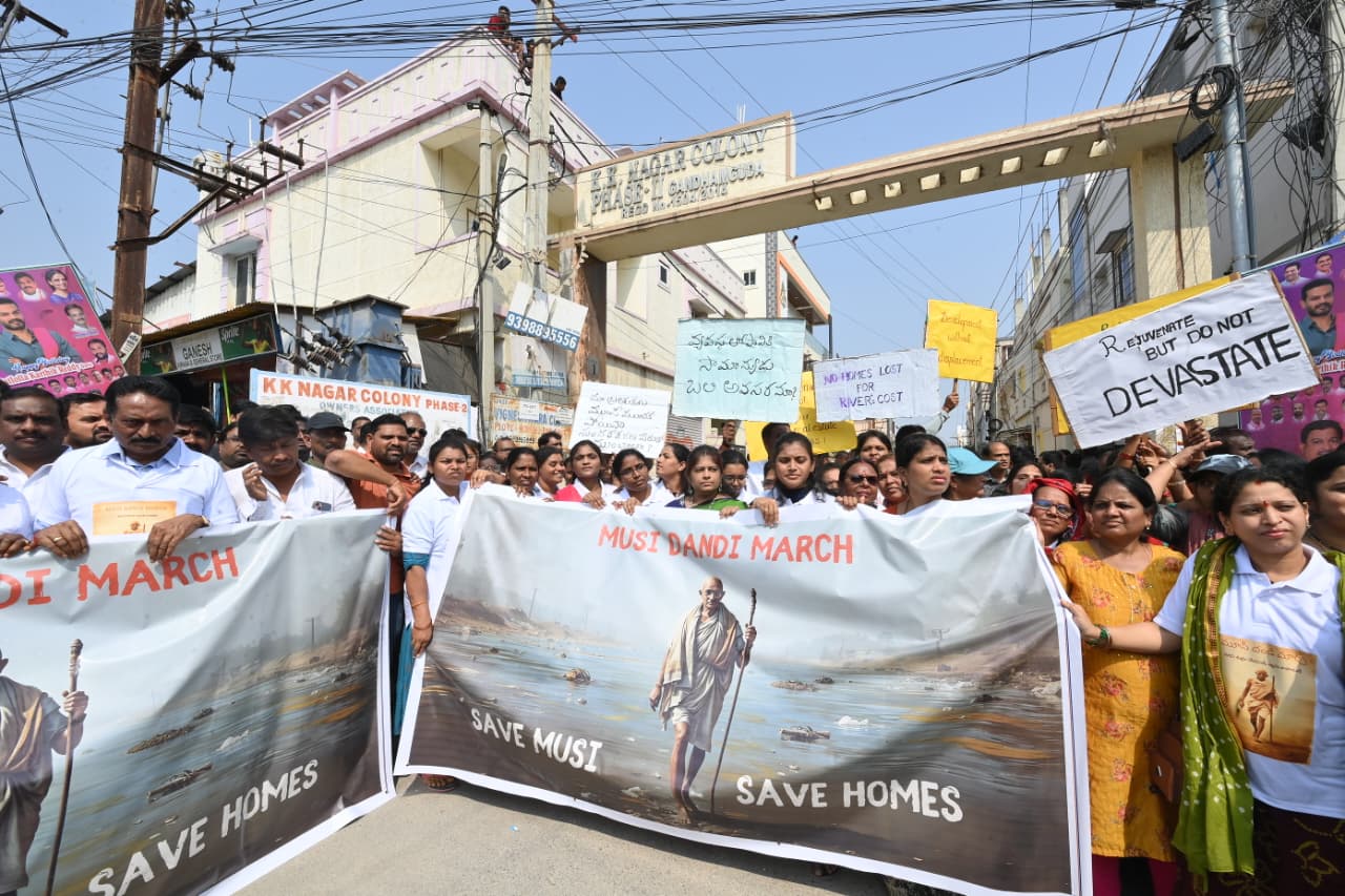 Today in Hyderabad, as part of the Musi project, KTR met victims from Hyder Shah Kote and Madhu Park Ridge Apartments in the Rajendranagar area, who are losing their houses, lands, and apartments. He expressed solidarity with them and participated in the 3.5 km "Musi Dandi March" padayatra.