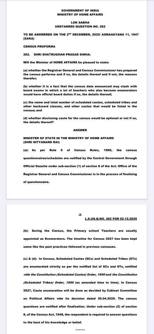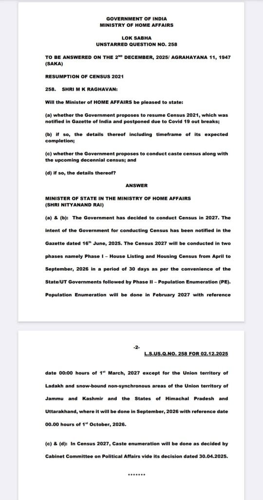 In a written reply, Minister of State for Home Nityanand Rai told Lok Sabha, "The Government has decided to conduct the Census in 2027. The intent of the Government for conducting the Census has been notified in the Gazette dated 16th June, 2025. The Census 2027 will be conducted in two phases, namely Phase I - House Listing and Housing Census from April to September 2026 in a period of 30 days, as per the convenience of the State/UT Governments, followed by Phase II - Population Enumeration (PE).