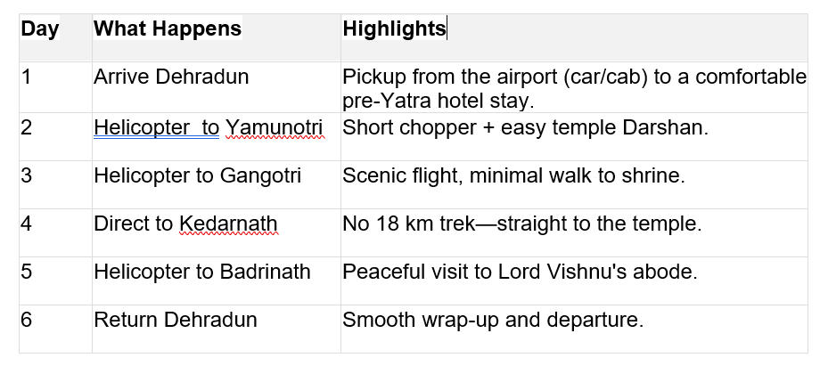 Effortless helicopter access to Yamunotri, Gangotri, Kedarnath, and Badrinath--perfect from the Dehradun base.