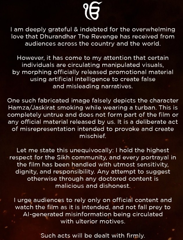 "One such fabricated image falsely depicts the character Hamza/Jaskirat smoking while wearing a turban. This is completely untrue and does not form part of the film or any official material released by us. It is a deliberate act of misrepresentation intended to provoke and create mischief," he added.