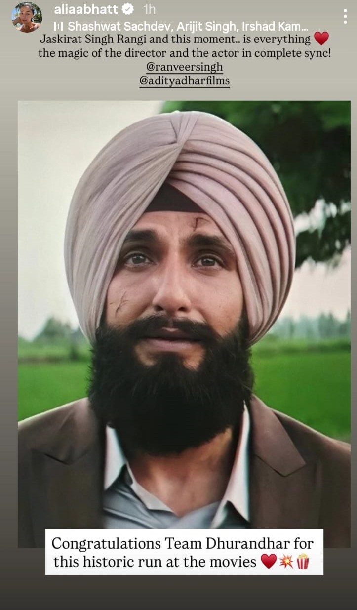 Taking to her Instagram handle, Alia Bhatt shared a still from 'Dhurandhar: The Revenge' featuring the emotional homecoming scene of Ranveer in the movie.