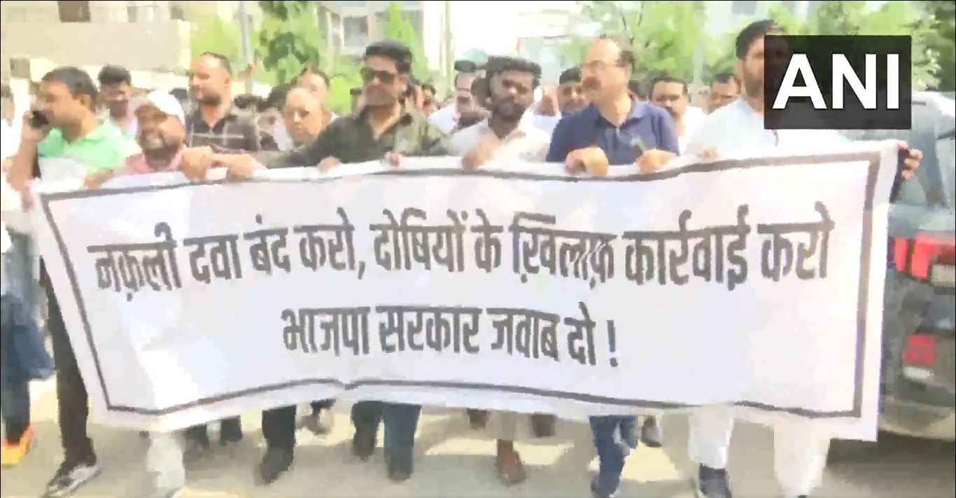 Concurrently, in Jaipur, Congress workers held banners with the slogan, "Nakli dawa band karo, doshiyo ke khilaaf karwayi karo, BJP sarkaar jawaab do".