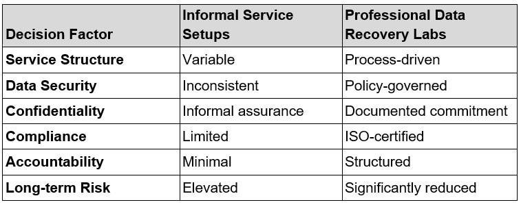 Data recovery is not merely a technical task -- it is a trust-driven decision. While pricing and timelines often influence initial choices, the long-term implications of data handling, privacy protection, and compliance deserve equal consideration.