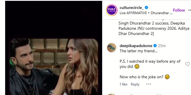 Taking to her Instagram handle, Deepika Padukone commented on a reel on social media which highlighted her absence at the Dhurandhar 2's screening and asked if "her silence was a delivery statement or is it the internet reading too much into celebrity social media silence?"