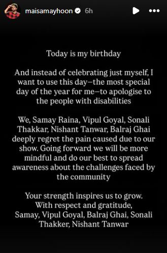 He wrote, "Today is my birthday. And instead of celebrating just myself, I want to use this day-the most special day of the year for me-to apologise to the people with disabilities. We, Samay Raina, Vipul Goyal, Sonali Thakkar, Nishant Tanwar, Balraj Ghai deeply regret the pain caused due to our show."