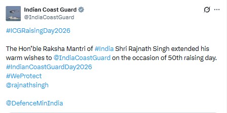 "The Hon'ble Raksha Mantri of #India Shri Rajnath Singh extended his warm wishes to @IndiaCoastGuard on the occasion of 50th raising day. #IndianCoastGuardDay2026 #WeProtect @rajnathsingh @DefenceMinIndia" the Indian Coast Guard wrote.