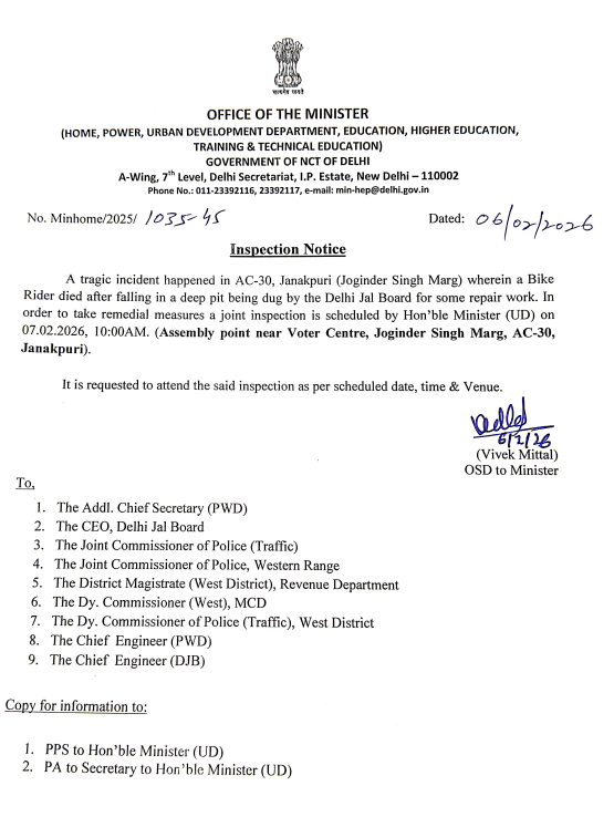 "The Delhi Jal Board expresses deep sorrow over the tragic accident that occurred during the Pipeline Rehabilitation Project (Pipeline Rehabilitation Site) of DJB in Janakpuri and extends its condolences to the bereaved family. A committee has been constituted to investigate the incident, and strict action will be taken if negligence is found at any level. Regular inspections of safety arrangements at all workplaces are ongoing. Citizens are requested to report any unsafe workplace on the toll-free number 1916," the post read.