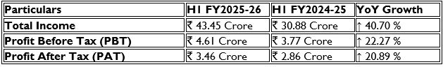 "The Company delivered a steady performance in H1 FY26 with revenue of ₹4213 lakhs and a PAT of ₹345.87 lakhs. Our margin profile remained stable, supported by disciplined cost management and operational rigor.
