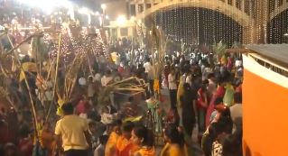 Devotees throng Shastri Ghat to offer 'Usha Arghya' to the rising sun on the last day of Chhath Puja.