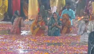 The devotees offer 'Usha Arghya' in Noida Sector 21. Women were seen in knee-deep water covered with rose petals, offering prayers to the rising sun on the last day of Chhath Puja.