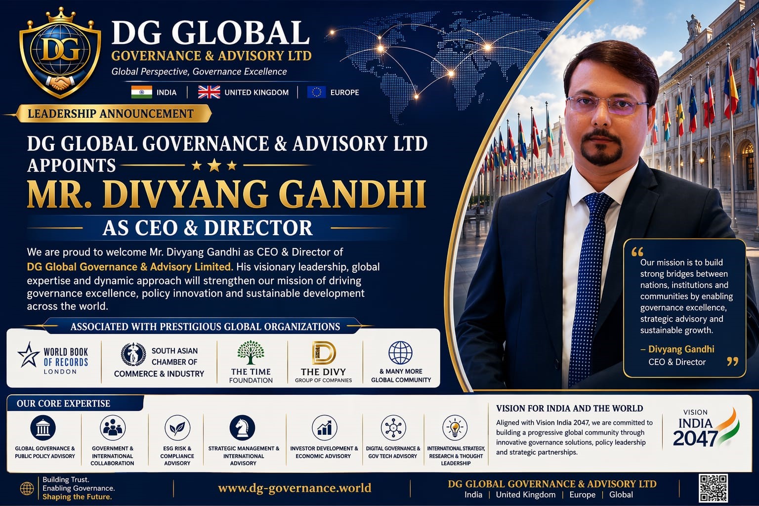 Under the leadership of Founder and CEO Mr. Divyangkumar Gandhi, the organization has positioned itself as a strategic link between governments, institutions, embassies, and international organizations. With a vision aligned to India Vision 2047, DG Global is focused on enhancing governance frameworks, enabling policy excellence, and supporting sustainable economic growth through cross-border partnerships. More details about the organization can be accessed at https://www.dg-governance.world