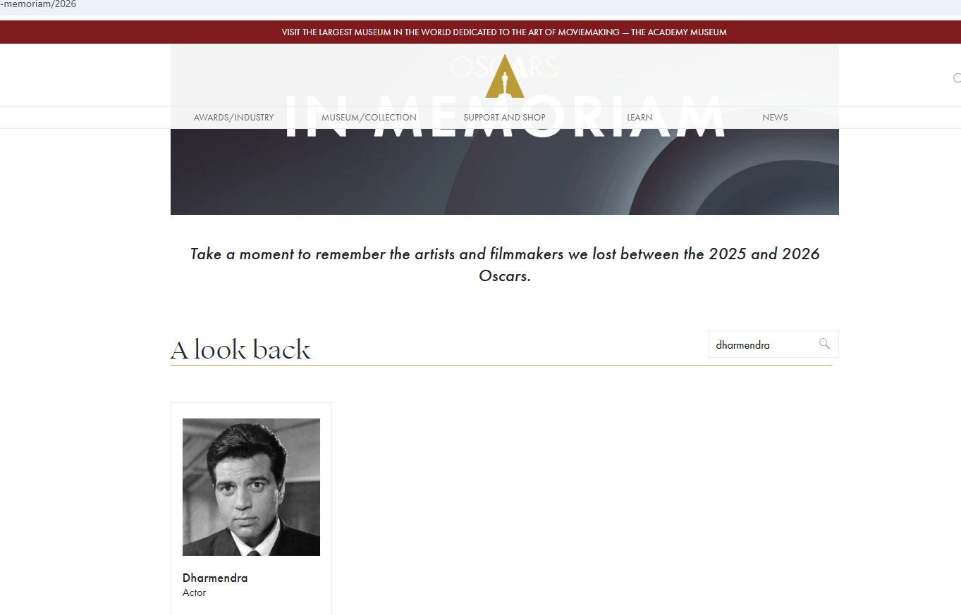 The legendary Bollywood actor, who passed away in November 2025 at the age of 89, was included in the Academy's official online In Memoriam list released on the day of the ceremony.