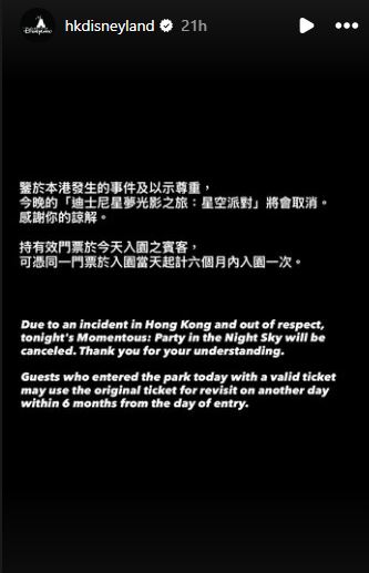 "Due to an incident in Hong Kong and out of respect, tonight Momentous: Party in the Night Sky will be cancelled," the resort posted later on Instagram. "Thank you for your understanding."