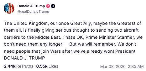 He said, "The United Kingdom, our once Great Ally, maybe the Greatest of them all, is finally giving serious thought to sending two aircraft carriers to the Middle East. That's OK, Prime Minister Starmer, we don't need them any longer -- But we will remember. We don't need people that join Wars after we've already won!"
