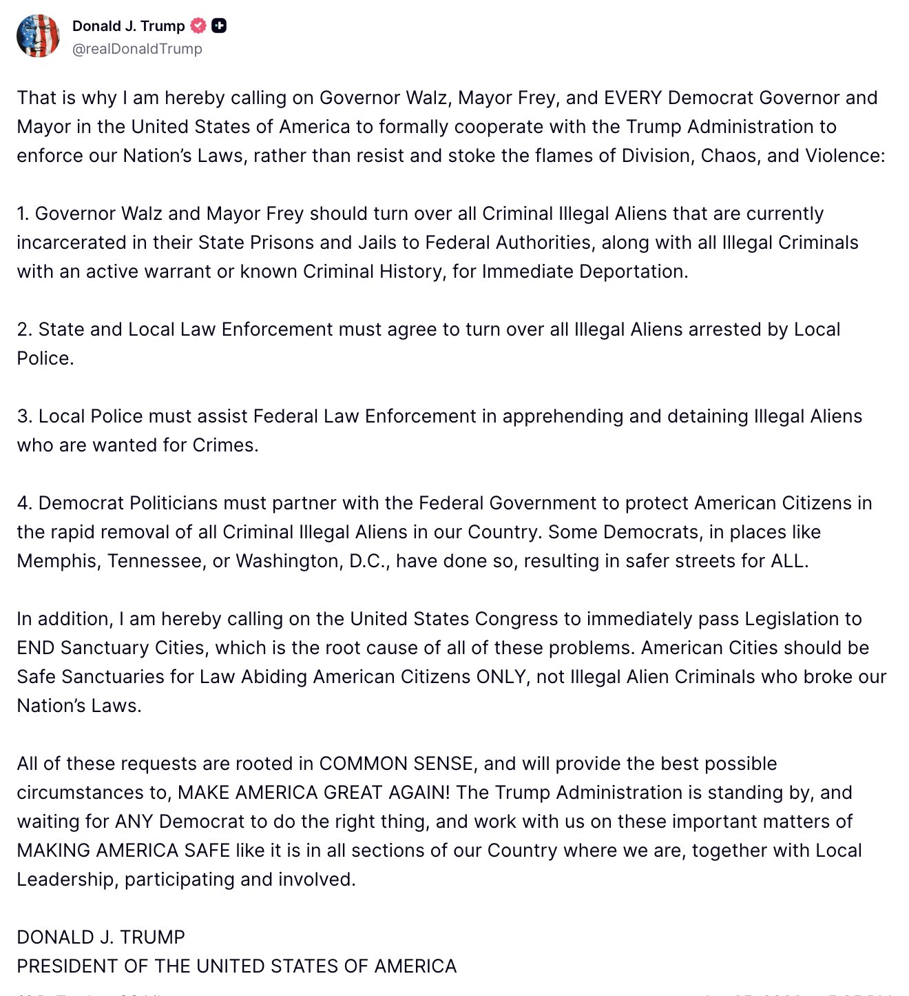 Through a series of posts on his social media platform Truth Social, Trump said, "Governor Walz and Mayor Frey should turn over all Criminal Illegal Aliens that are currently incarcerated in their State Prisons and Jails to Federal Authorities, for immediate deportation," adding that state and local law enforcement must agree to turn over all illegal aliens arrested by local police. He added that the local police must assist Federal Law Enforcement in apprehending and detaining "Illegal Aliens" who are wanted for "Crimes."