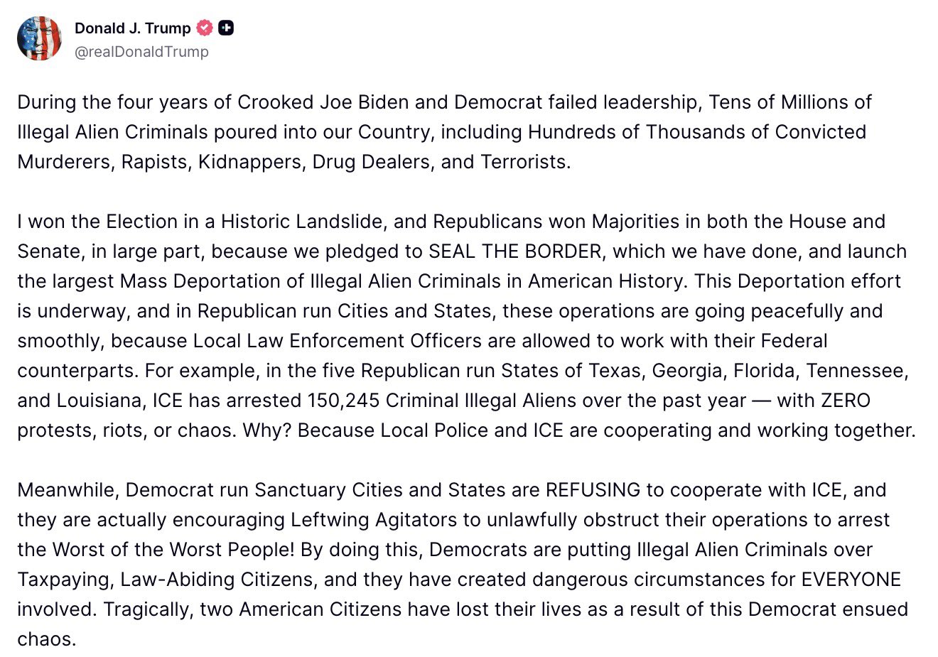 In a separate post, Trump alleged that during President Joe Biden's tenure, "Tens of Millions of Illegal Alien Criminals" entered the country, including "Hundreds of Thousands of Convicted Murderers, Rapists, Kidnappers, Drug Dealers, and Terrorists". He said his administration had "sealed the border" and launched what he described as the largest deportation effort in US history.