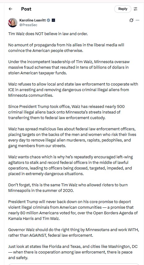 Responding to criticism from Governor Walz, White House Press Secretary Karoline Leavitt posted on X, accusing the Minnesota governor of undermining law and order. She allleged that under Walz's leadership, Minnesota witnessed large-scale fraud involving taxpayer funds and claimed the state had released nearly 500 undocumented immigrants with criminal records instead of transferring them to federal custody.
