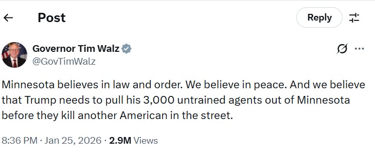 Governor Walz, in a post on X, defended Minnesota's stance, saying that the state believes in "law and order and peace," while accusing the Trump administration of deploying "untrained agents" in Minnesota. "Trump needs to pull his 3,000 untrained agents out of Minnesota before they kill another American in the street."