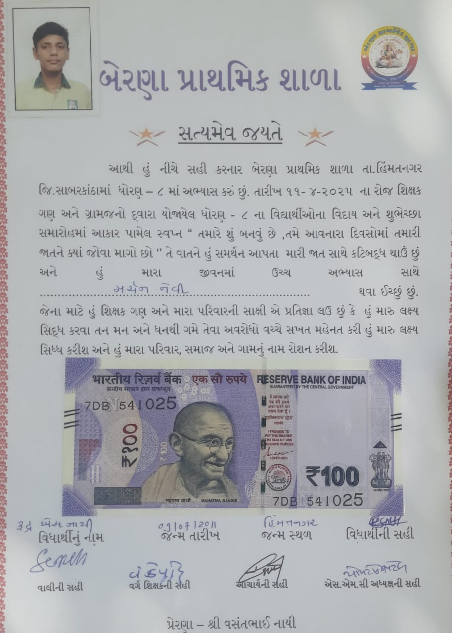 Under the regular efforts of the state government to encourage education and aspiration among students, Berana Primary School adopted an innovative idea from the village Sarpanch: turning a simple Class 8 farewell ceremony into a powerful life lesson. As part of this event, each graduating student shares their dream for the future and receives a "Dream Commitment Certificate", a symbolic pledge to work hard, stay focused, and make their family and village proud.